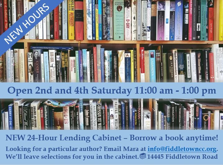 Stop by and grab a book anytime that is convenient for you. Looking for a specific author or genre? Contact us and we will leave selections in the cabinet for you to pick up.